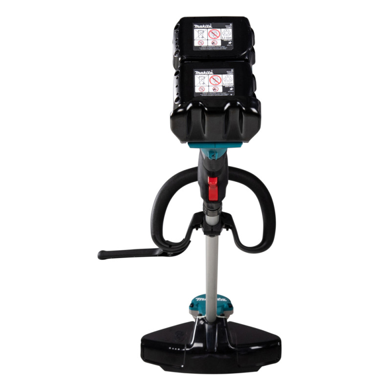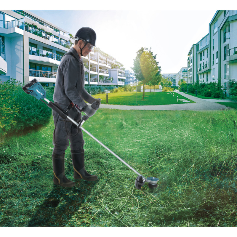 Makita DUR368LZ accu trimmer (2x18V) met borstelloze motor levert 36V vermogen. 3 snelheden, ADT automatische snelheidsregeling, achteruitfunctie en elektrische rem. XPT-bescherming tegen stof en water. Stil en trillingsarm met beugelhandgreep en tot 350 mm maaibreedte.