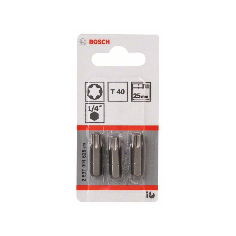 Prekės ženklas- Bosch. Artikulas- 2 607 001 625. Ilgis- 25 mm. Medžiaga- Plienas. Magnetinė galvutė- Ne. Lankstus- Ne. Garantija- 24 mėn. Komplekto dalių skaičius- 3. Komplekte- T40. Papildoma informacija- Medžiaga: plienas. Ilgis: 25 mm.